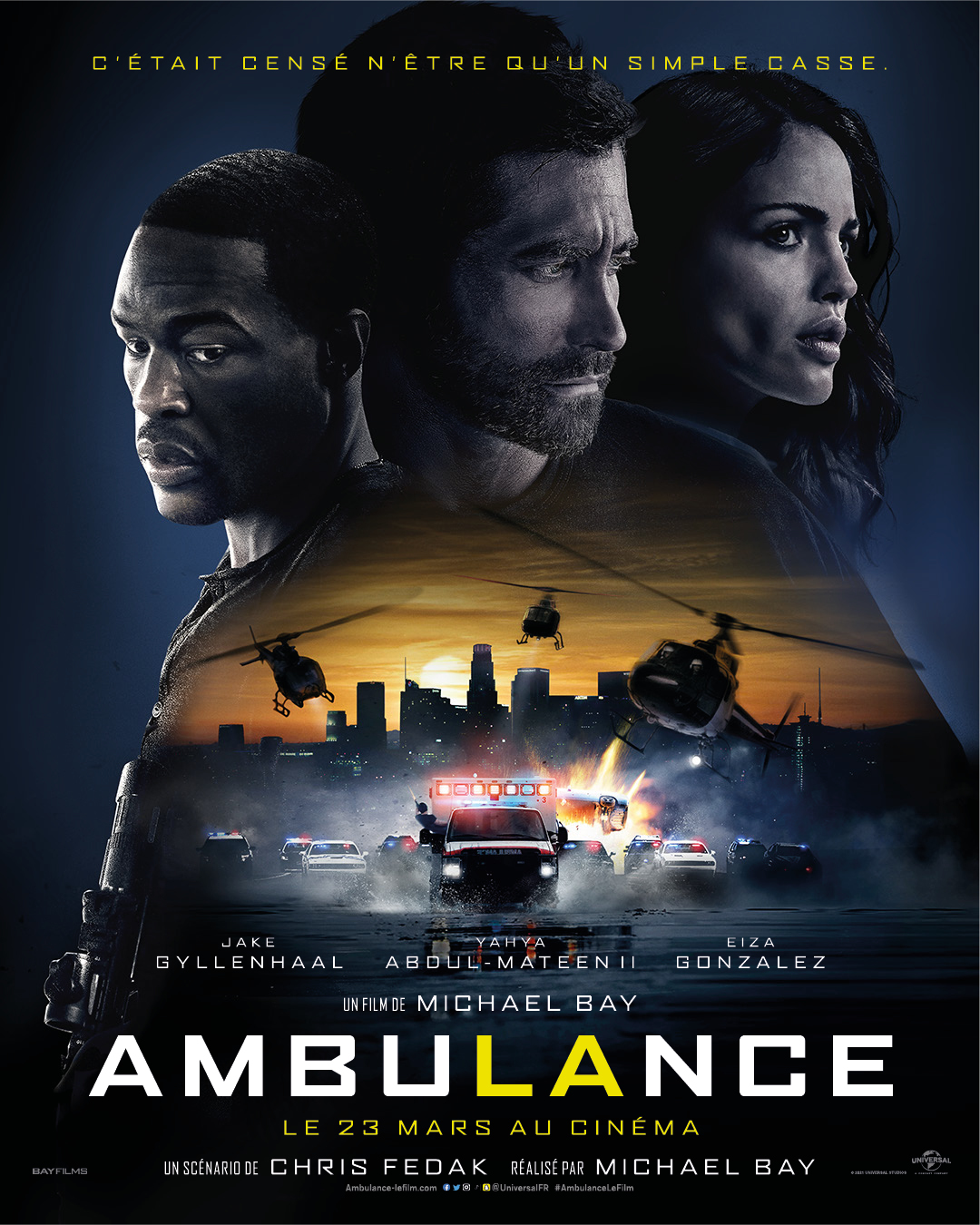 Will Sharp, un vétéran décoré fait appel à la seule personne indigne de confiance, son frère adoptif Danny pour trouver l’argent afin de couvrir les frais médicaux de sa femme. Ce dernier, un charismatique criminel au long cours, au lieu de lui donner de l’argent, lui propose un coup : le plus grand braquage de banque de l’histoire de Los Angeles : 32 millions de dollars. Will, prêt à tout pour sauver sa femme, accepte. Mais quand leur affaire prend un tour spectaculairement désastreux, les deux frères n’ont pas d’autre choix que de détourner une ambulance avec à son bord un flic mortellement blessé et l’ambulancière Cam Thompson. Pendant la course poursuite infernale qui s’ensuit, Will et Danny vont devoir échapper aux forces de l’ordre surmotivées postées aux 4 coins de la ville, tenter de garder leurs otages en vie et éviter de s’entretuer, tout en exécutant l’évasion la plus spectaculaire que la ville de Los Angeles n’ait jamais vue.
